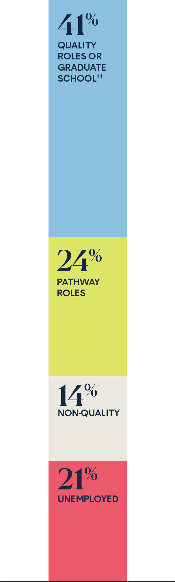 11. 41% is the percentage of NIU Fellows who secured a quality job or enrolled in graduate school. All outcome percentages are based on NIU Fellows for which their post-graduation outcome is known (77% or 147 out of the total 192 Fellows’ outcome is known).